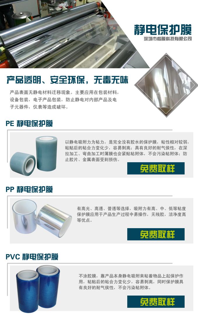 透明PE靜電保護膜具有較好的耐候性及持粘力穩定性,易于揭去,在揭去時被保護表面上沒有殘膠留存,無留影。